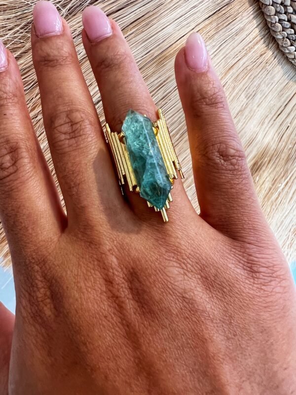 La monture dorée, finement travaillée, met en valeur la pierre brute et sa teinte verte apaisante. Ce contraste entre l’or lumineux et la profondeur de l’aventurine évoque la nature et le renouveau. Chaque pierre étant unique, chaque bague devient une création singulière, vibrante et vivante.