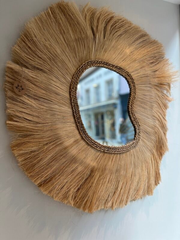 Ce miroir mural en fibres naturelles s’harmonise parfaitement avec d’autres éléments de décoration artisanale tels que les statuettes en pierre ou les cercles en cauris .